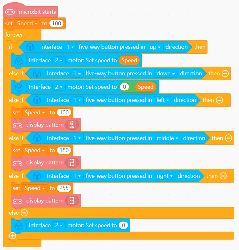Speed with initial value 100.Speed.Speed.Speed.0 - Speed.Speed to 100 and display pattern 1 on screen.Speed to 180 and display pattern 2 on screen.Speed to 255 and display pattern 3 on screen.