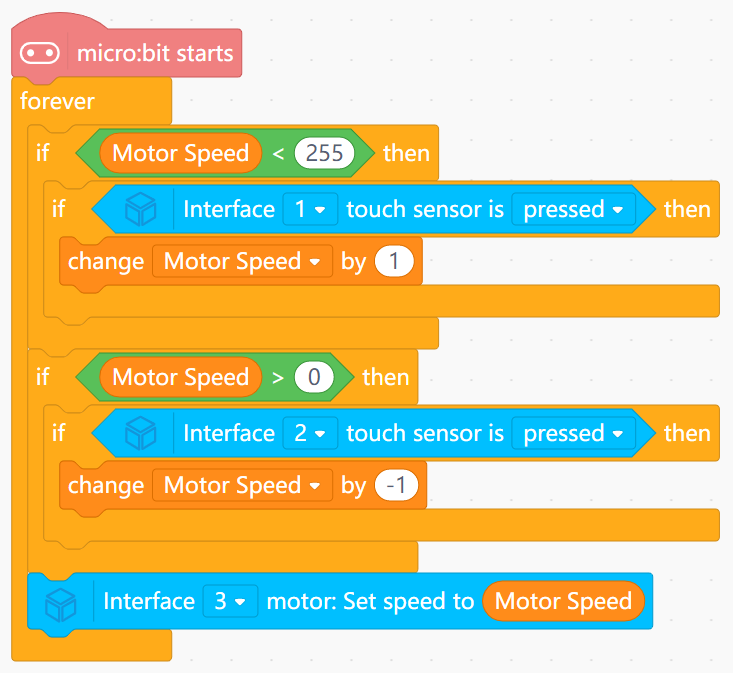 Let two touch sensors act as "speed-up" and "slow-down" controls for the running robot.