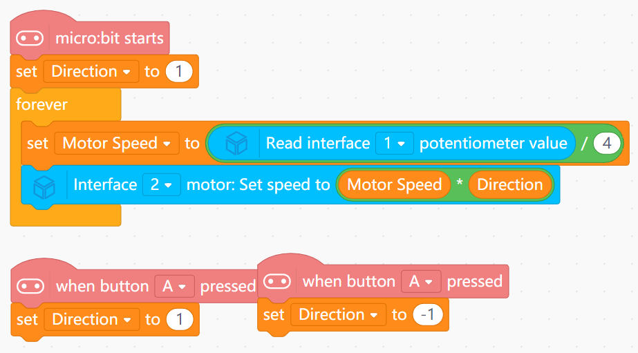 Dir (1 or -1) via Buttons A/B.BaseSpeed = Potentiometer / 4.FinalSpeed = BaseSpeed * Dir.