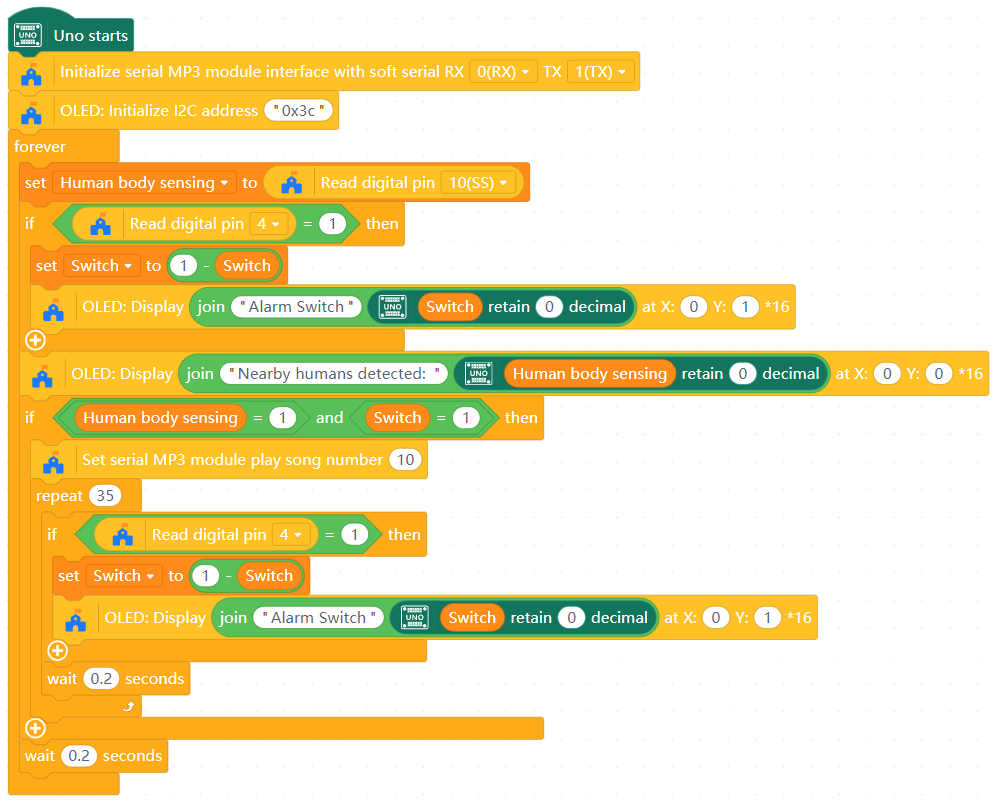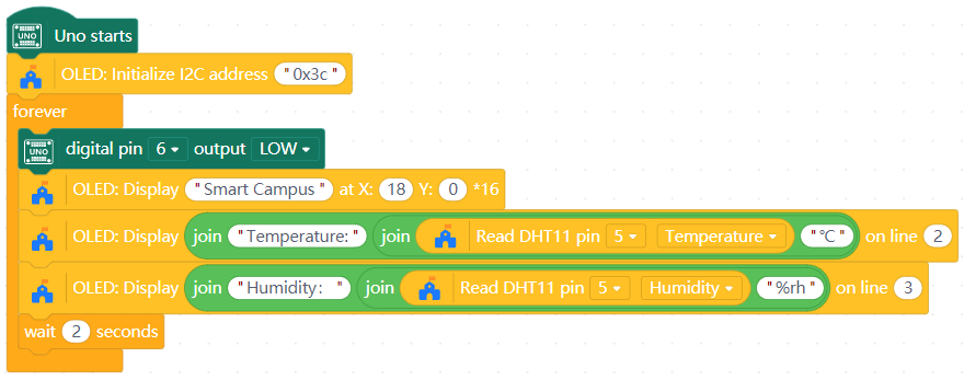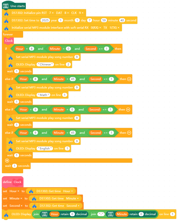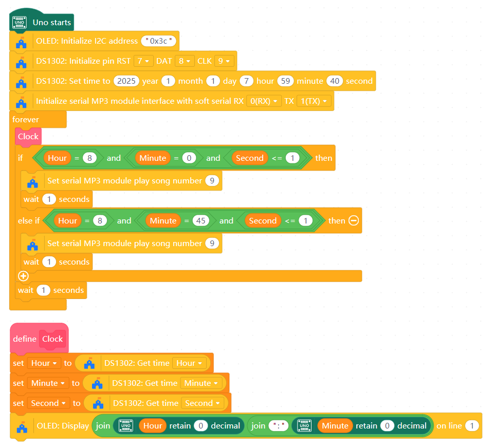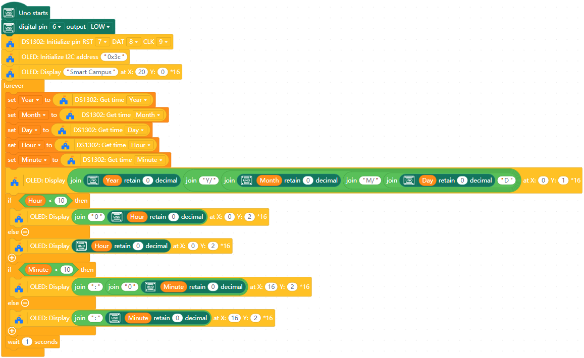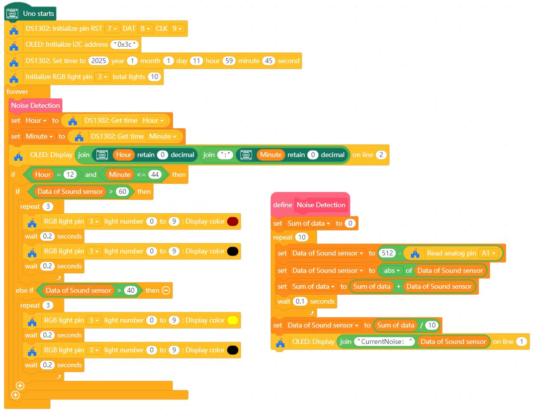 Sound sensor data, Sum of data, Hour, and Minute.Sound sensor data.Sum of data, before reading it back into Sound sensor data.Sound sensor data on OLED line 1.Sound sensor data.Hour and Minute.Sound sensor data is high (e.g. over 60), have the RGB light strip rapidly flash red.Sound sensor data is medium (e.g. between 40 and 60), have the RGB light strip flash yellow.Sound sensor data is low (e.g. under 40), have the RGB light strip shine green.