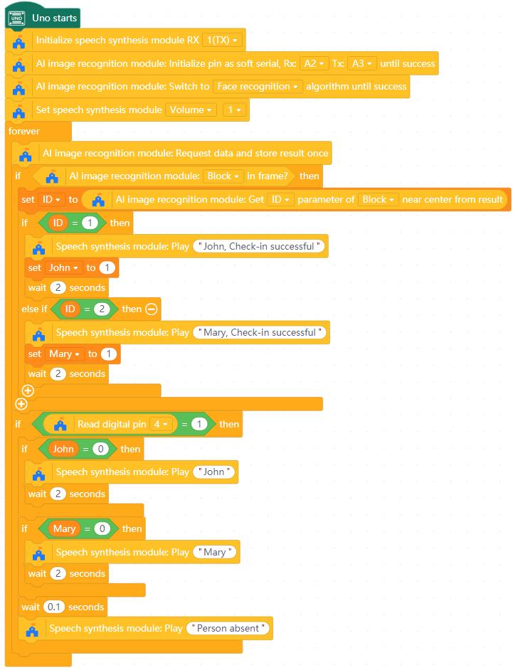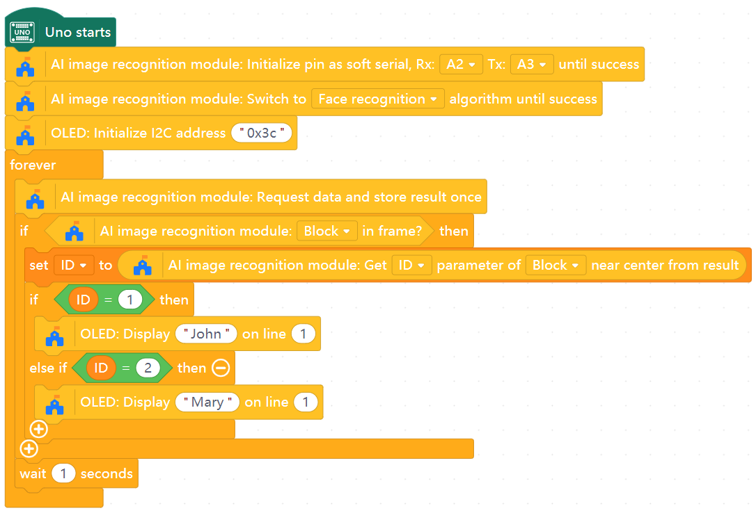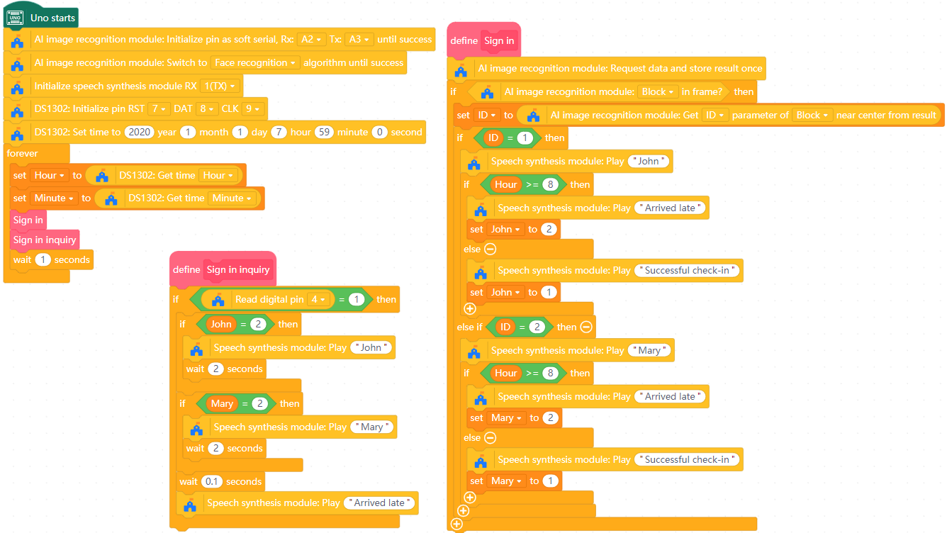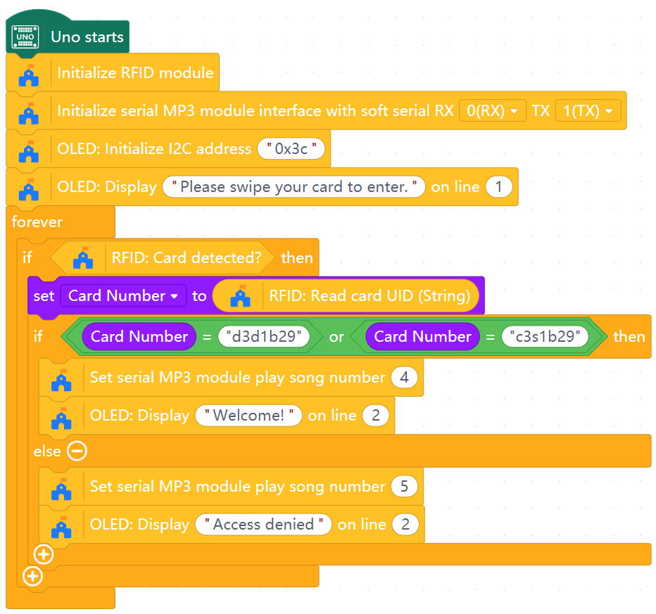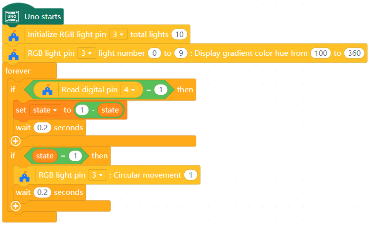 Sound sensor data, Sum of data, Hour, and Minute.Sound sensor data.Sum of data, before reading it back into Sound sensor data.Sound sensor data on OLED line 1.Sound sensor data.Hour and Minute.Sound sensor data is high (e.g. over 60), have the RGB light strip rapidly flash red.Sound sensor data is medium (e.g. between 40 and 60), have the RGB light strip flash yellow.Sound sensor data is low (e.g. under 40), have the RGB light strip shine green.