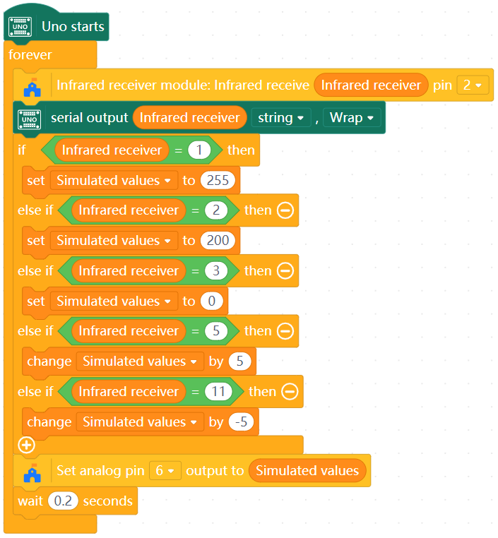 Infrared receiver on OLED or serial output to understand typical values.Simulated values to 255.Simulated values to 200.Simulated values to 0.Simulated values by 5 or -5, respectively.Simulated values.