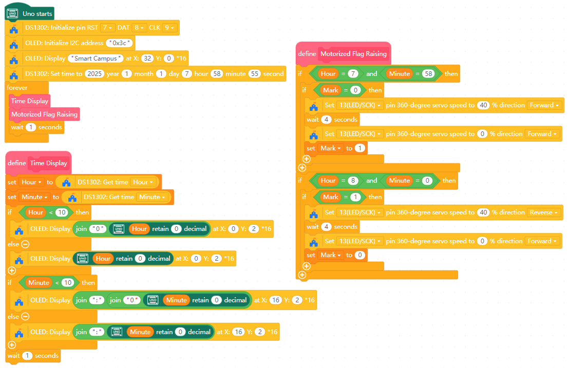 Mark variable is the program’s memory of where the flag should be now.Mark before moving, we avoid “over-raising” or “over-lowering” the flag.Hour, Minute, and Mark.Hour and Minute.Hour and Minute on the OLED screen.