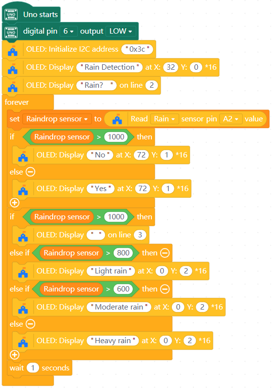 Raindrop sensor.Raindrop sensor.Raindrop sensor on OLED line 1.Raindrop sensor is below a certain value (e.g. 800):