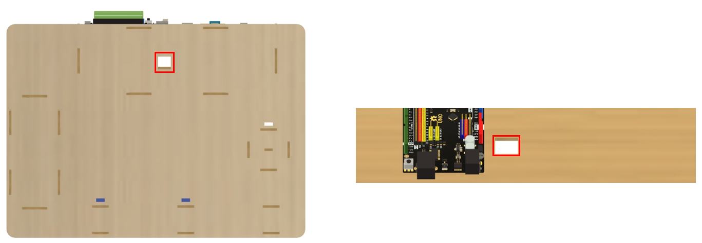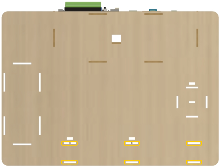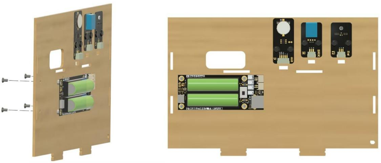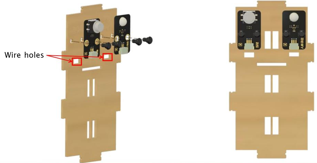 Take the right wall plate (wooden plate #3) and fasten the button and human sensor modules as shown.