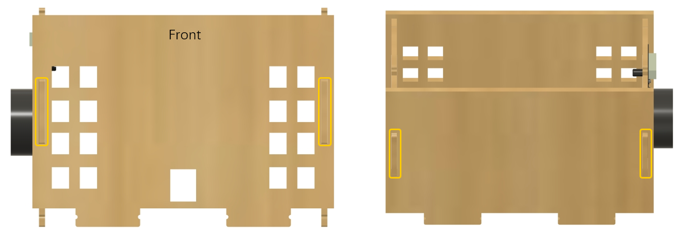Attach the RFID module to the canteen roof plate (wooden plate #12) as shown, then attach the canteen roof plate to the top of the canteen structure with the RFID module closer to the left wall and secure the wooden tabs with rubber bands.