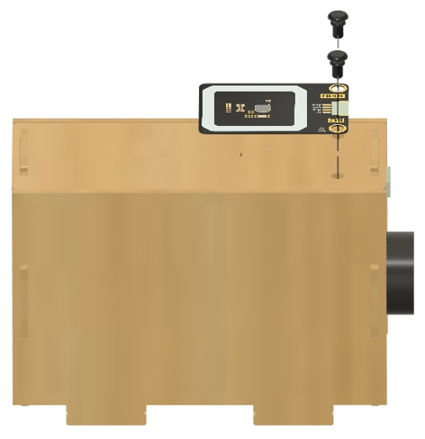 Attach the OLED screen to the space at the top of the wooden plate #2 using four of the black fasteners shown in the image. (Do not separate the two parts of the black fasteners, simply push them through the holes as indicated in the diagram until they tighten.)