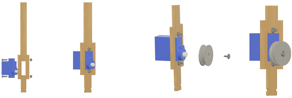 Take the flagpole (wooden plate #17) and insert the 360-degree servo through the rectangular hole, securing it with two M2 screws + nuts. Fix the large pulley wheel to the servo shaft using the servo shaft screw, then connect the small pulleys to the other end of the flagpole and run the large rubber band between the small and large pulleys.