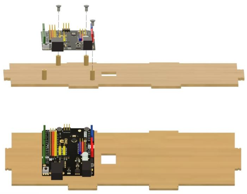 Using 3 more M3*6 countersunk screws, attach the Arduino Uno to the copper pillars as shown.