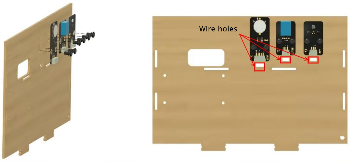 Fix the rain sensor, light sensor, IR receiver, and AI OLED screen modules to the main building roof plate (wooden plate #7) as shown; with their cables routed through the designated holes.