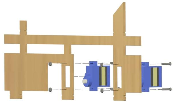 Take the school gate backboard (wooden plate #20) and attach the two 180-degree servo motors in the positions shown, fastening them to the board with a pair of long M2 screws and nuts. (Note: take care to use the 180-degree servos and not the 360-degree servo - despite their similar appearance, they are labeled accordingly on their bags.)